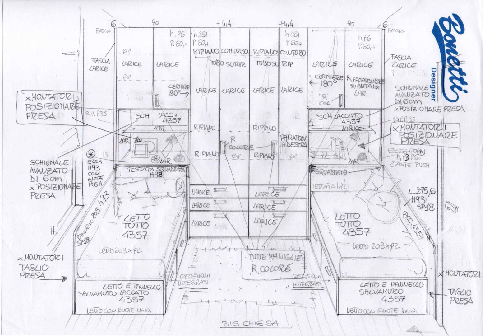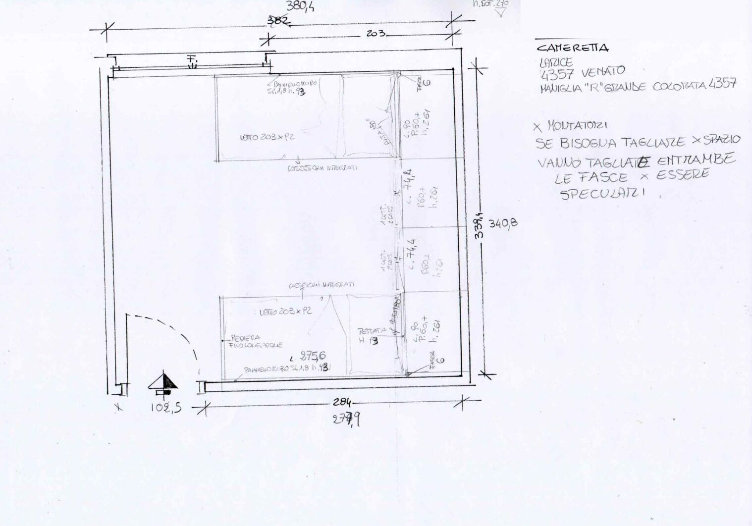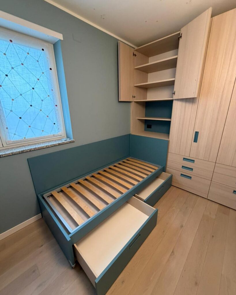 Esigenza: arredare tre pareti della stanza per inserire due letti a terra facili da rifare, escludendo l’utilizzo del classico armadio a ponte.