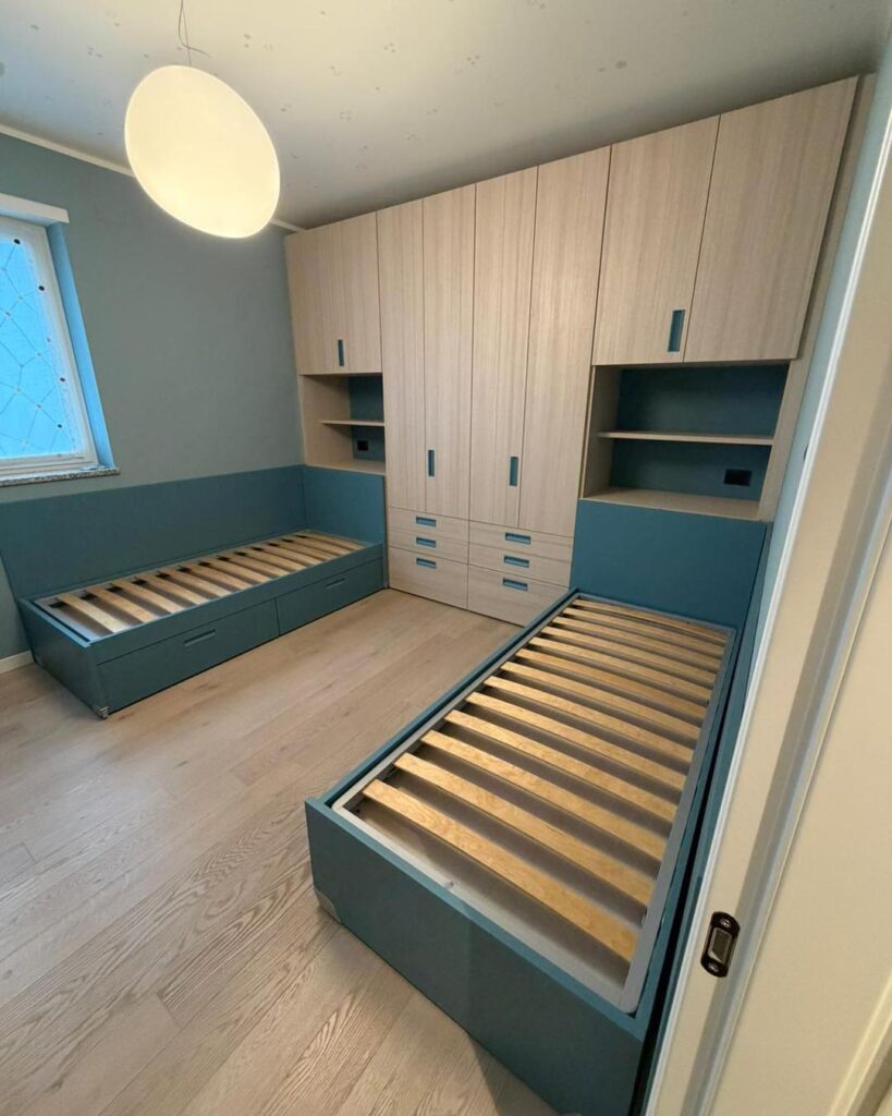 Soluzione: per soddisfare la richiesta del cliente, abbiamo progettato una composizione su misura che distribuisce l’arredo in modo estremamente funzionale. Abbiamo inserito degli elementi armadio capienti e completamente sfruttabili, posizionando i letti davanti a essi; grazie a questa disposizione, i letti possono essere spostati con facilità per agevolare il riordino e il rifacimento quotidiano. A dividere visivamente e in modo equo gli spazi, abbiamo collocato al centro due colonne armadio identiche, garantendo così a ogni figlio la propria area dedicata e indipendente.